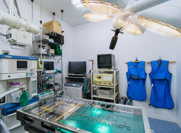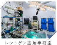 手術や各種検査・処置、レントゲン撮影ができます。レントゲン室と手術室が同じなため、手術中にレントゲン撮影ができます。特に骨折などの整形外科に重宝します。