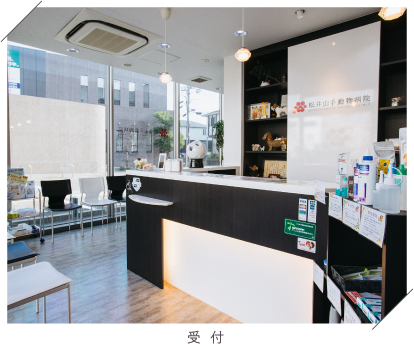 当院のロゴがあしらわれたおしゃれな受付です。広めに設計してあるので、複数の方の対応が可能です。