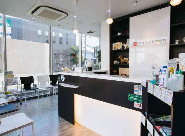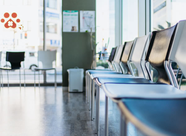 ガラス張りの壁面から日の光が差し込む、明るく清潔感のある空間です。また他のワンちゃん、ネコちゃんが苦手な子は柱を挟んで分かれて座れるようになっています。