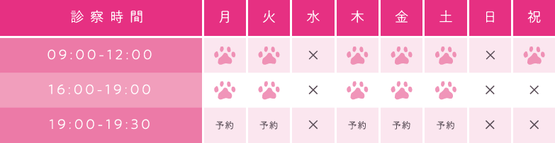 ※19:00~19:30:予約診察(要予約)、前日までに受付・お電話・LINEにてご予約下さい。